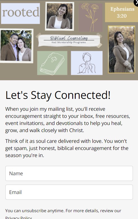 Whether you’re just getting started or ready for a deeper journey, I offer Christ-centered programs to support your healing and growth. From free events like Comforted by His Love, to focused workshops like the 3-Day Forgiveness Challenge, to the full 9-week Rooted in His Love program—there’s a next step for you.